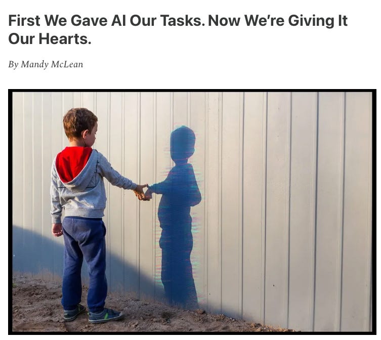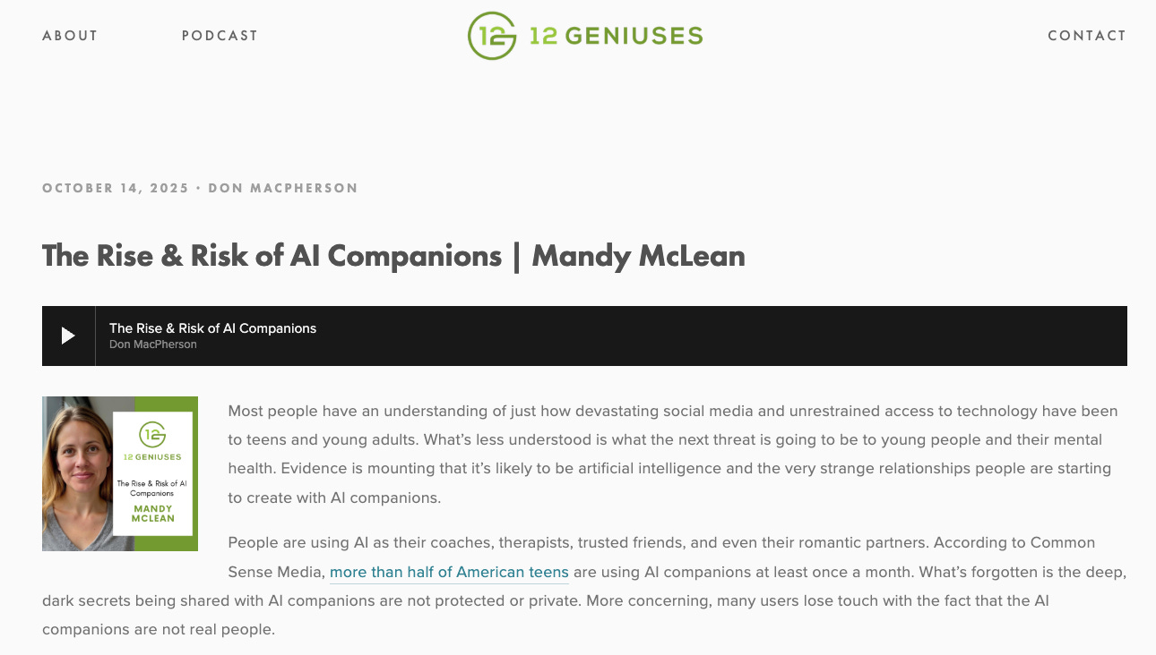 “First We Gave AI Our Tasks. Now We’re Giving It Our Hearts”: AI is no longer just automating tasks. It’s shaping emotional lives, especially for children. This piece, written with Jonathan Haidt and Zach Rausch, explores how “emotional offloading” to AI companions is changing what learning and connection mean.12 Geniuses Podcast