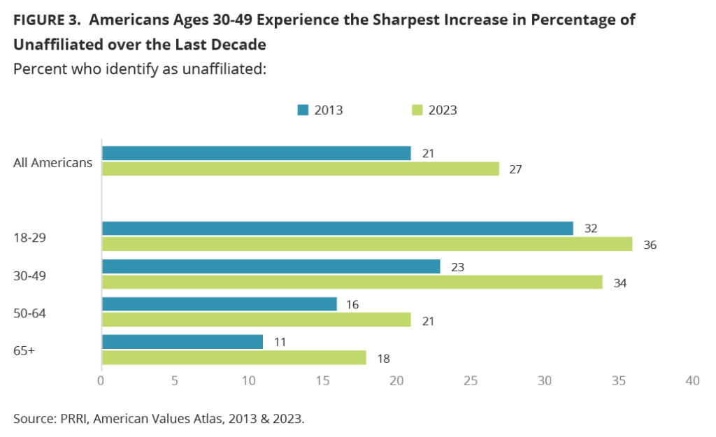 I left, like a lot of people my age. Nearly 27 percent of Americans now identify as religiously unaffiliated, up from 21 percent a decade ago. Among people under 50, it’s just over a third. We (collectively) left for lots of reasons, from politics to scandals to intellectual disagreement to the slow drift of a generation raised with weaker ties than the one before. But here’s what I’ve started to wonder: what if the reasons matter less than what they had in common? We left the things that asked something of us.